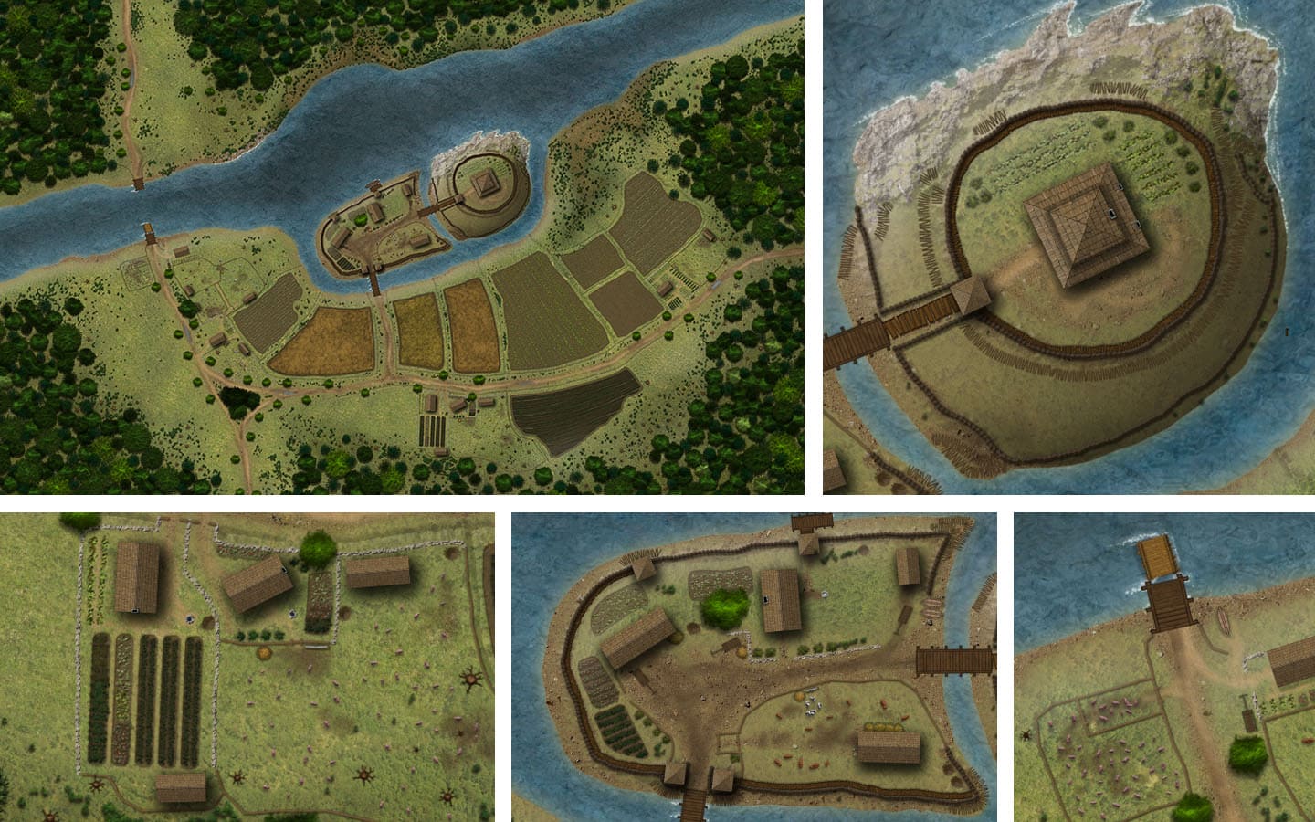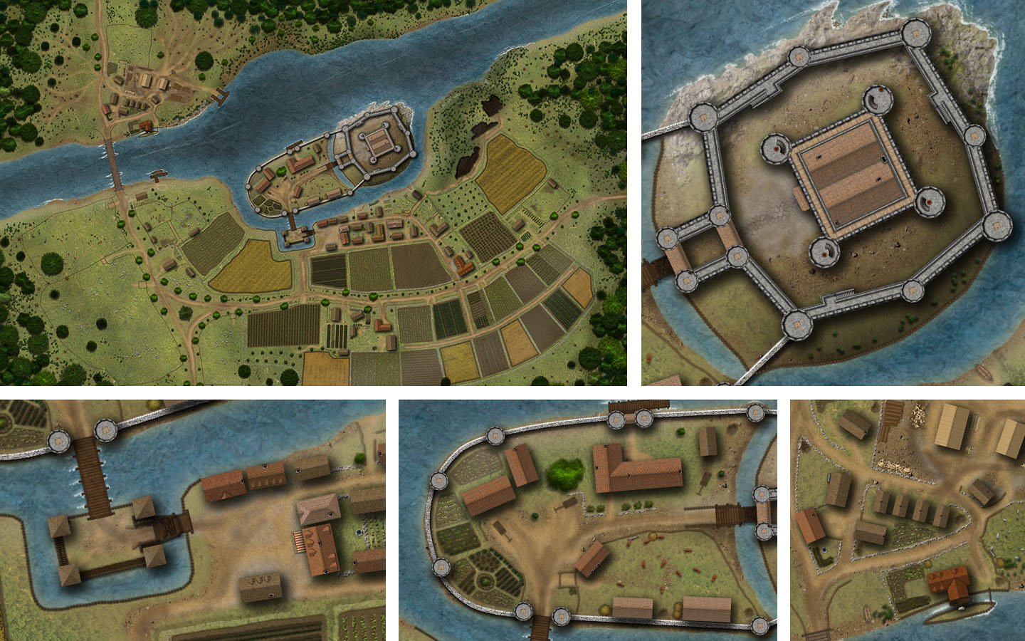 Die Kartenserie „Die Wasserburg“ enthält drei liebevoll gestaltete Karten des Städtchens Lombourg mit seinen Wehranlagen. Die Siedlung entwickelt sich im Verlaufe der drei Karten vom einfachen Weiler zum prächtigen Städtchen. Das PDF kommt mitsamt einer stimmungsvollen Beschreibung und mehreren Abenteuerideen. Alle unsere Karten sind Teil einer vernetzten, persistenten Welt.